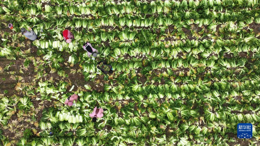 11月28日,山東省臨沂市郯城縣馬頭鎮圩東村菜農在收獲大白菜,確保市場(chǎng)供應(無(wú)人機照片)。