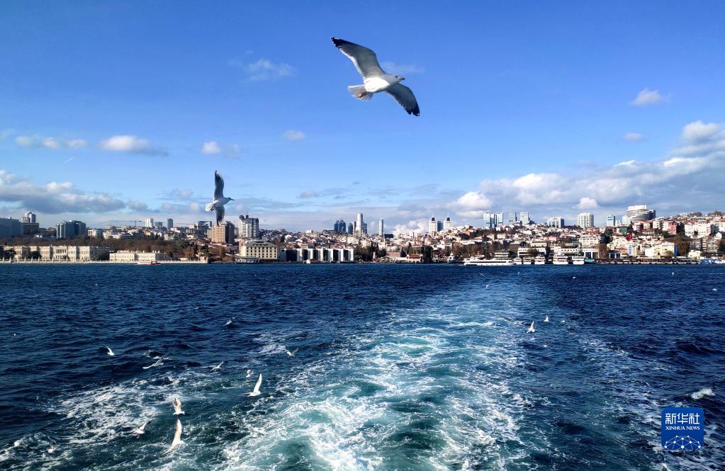 11月27日,海鷗在土耳其博斯普魯斯海峽的水面上覓食。