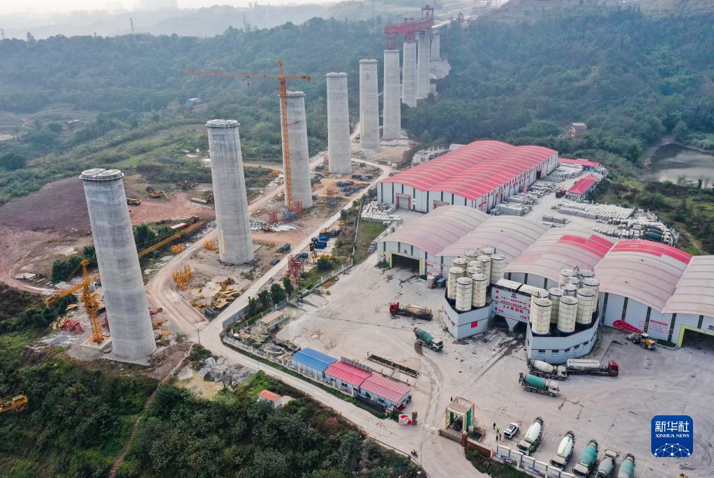 這是11月28日拍攝的渝昆高鐵川渝段站前一標2號拌和站及華福特大橋作業(yè)現場(chǎng)(無(wú)人機照片)。