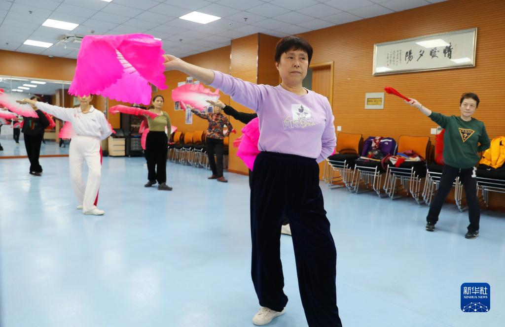 11月29日,健康聯(lián)盟興趣小組的居民在上海市虹口區市民驛站嘉興路街道第一分站跳扇子舞。