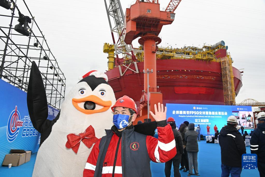 11月29日,一名工人在企鵝圓筒型浮式生產(chǎn)儲卸油裝置(FPSO)交付儀式上與吉祥物合影。