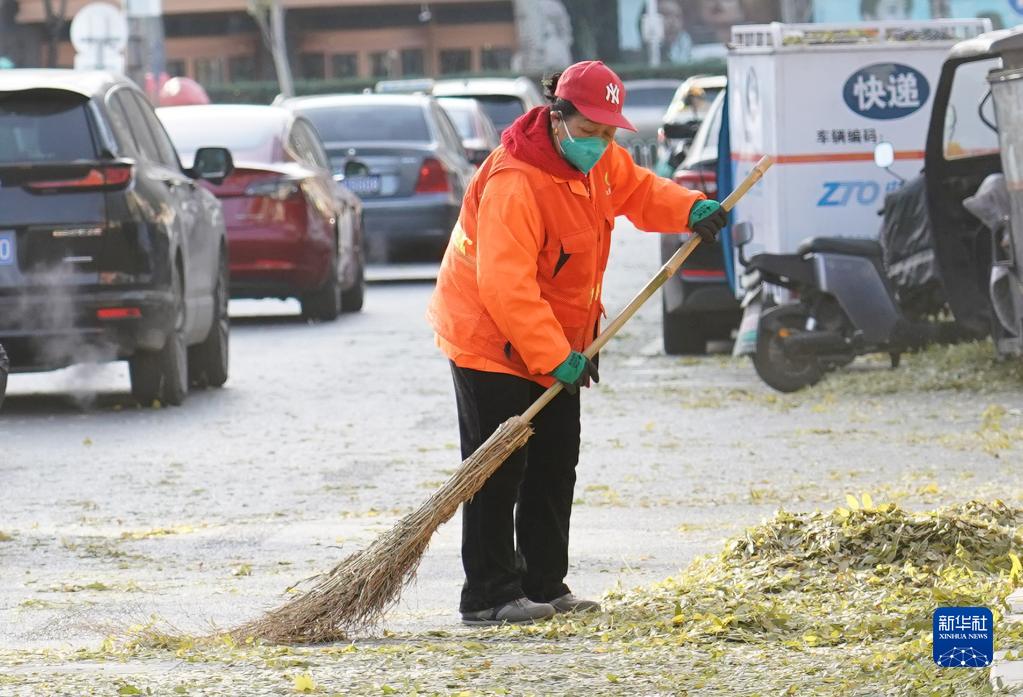11月29日,在北京市海淀區科學(xué)院南路,環(huán)衛工人在寒風(fēng)中清掃落葉。