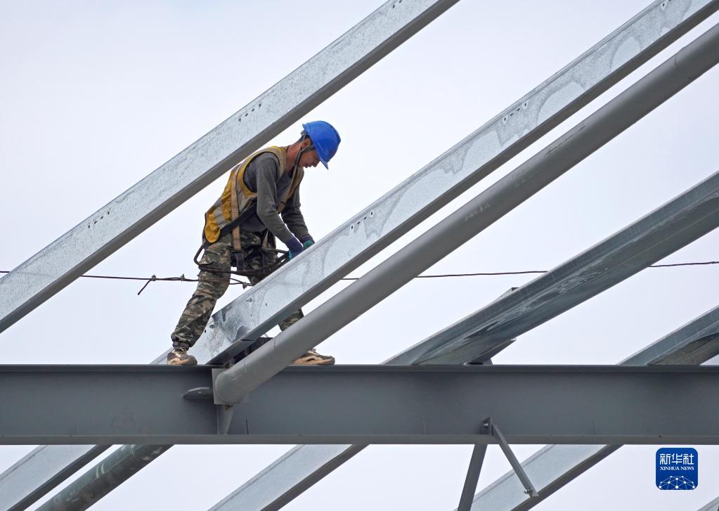 工人在中新南寧國際物流園的電商物流園進(jìn)行頂棚施工(11月29日攝)。
