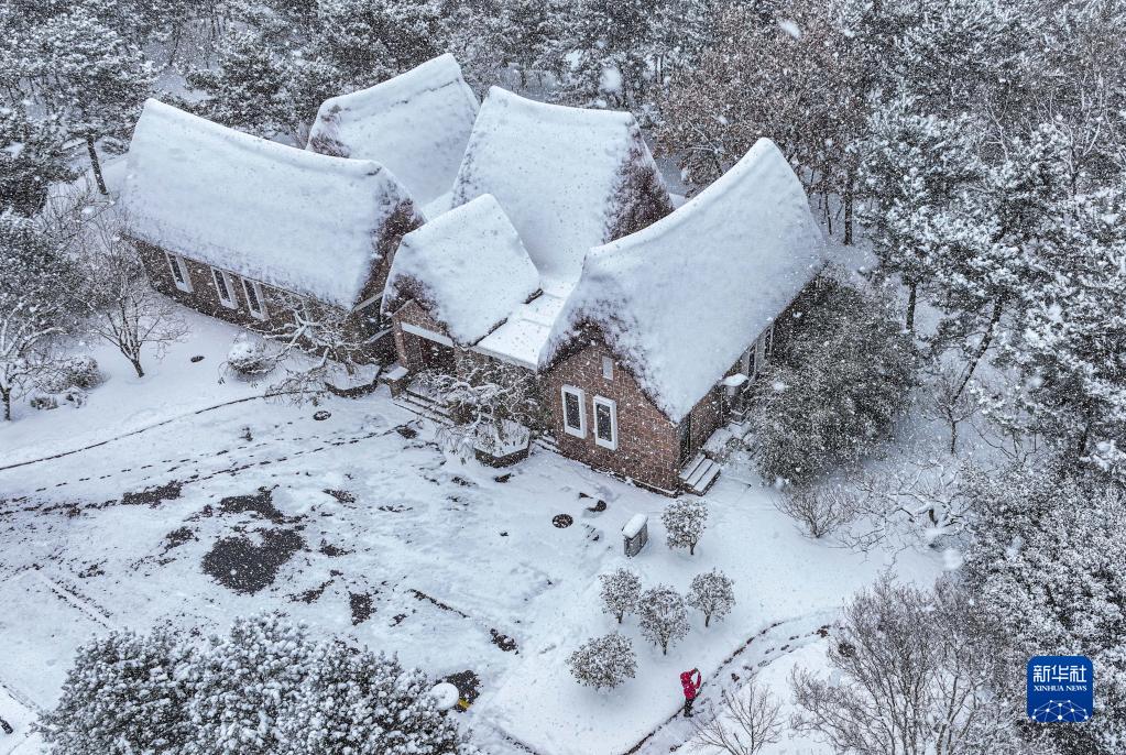 11月30日在山東省榮成市拍攝的白雪覆蓋下的一處海草房景觀(guān)建筑。