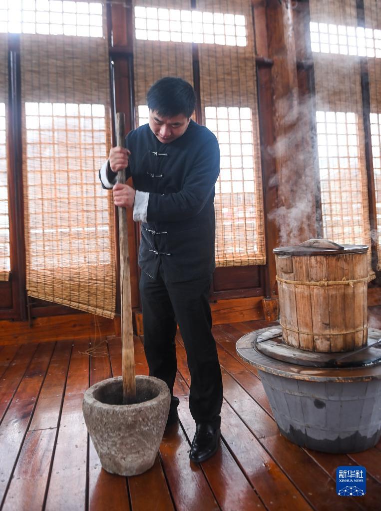 11月30日,大唐貢茶院的紫筍茶制作技藝傳承人林瑞煬采用傳統方法制茶。這是將蒸好的鮮葉放入石臼中,用木棍搗碎。