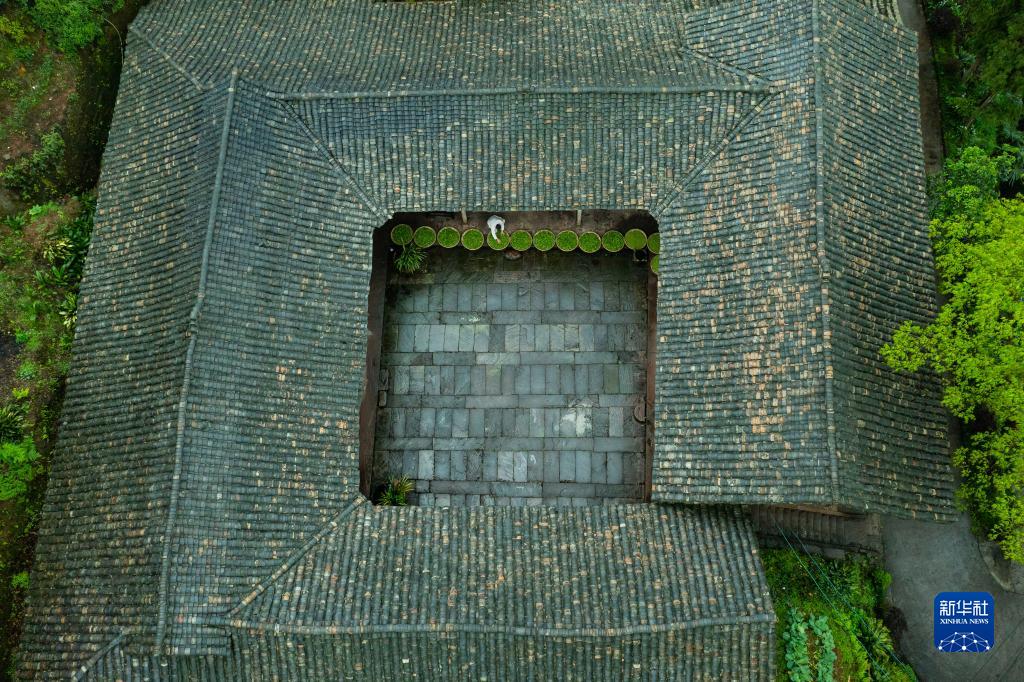 在四川省雅安市名山區的張氏祖屋,張躍華在攤晾剛采摘的鮮葉(2022年3月31日攝,無(wú)人機照片)。蒙山茶產(chǎn)于四川省雅安市名山區境內的蒙頂山,是綠茶的一種。張躍華,生于1959年,是國家級非物質(zhì)文化遺產(chǎn)代表性項目——綠茶制作技藝(蒙山茶傳統制作技藝)的代表性傳承人。張躍華自幼隨父親學(xué)習蒙山茶傳統制作技藝,是“張氏甘露”第五代傳人,他每年都要招收年輕徒弟,希望蒙山茶傳統制作技藝能世世代代傳承下去。