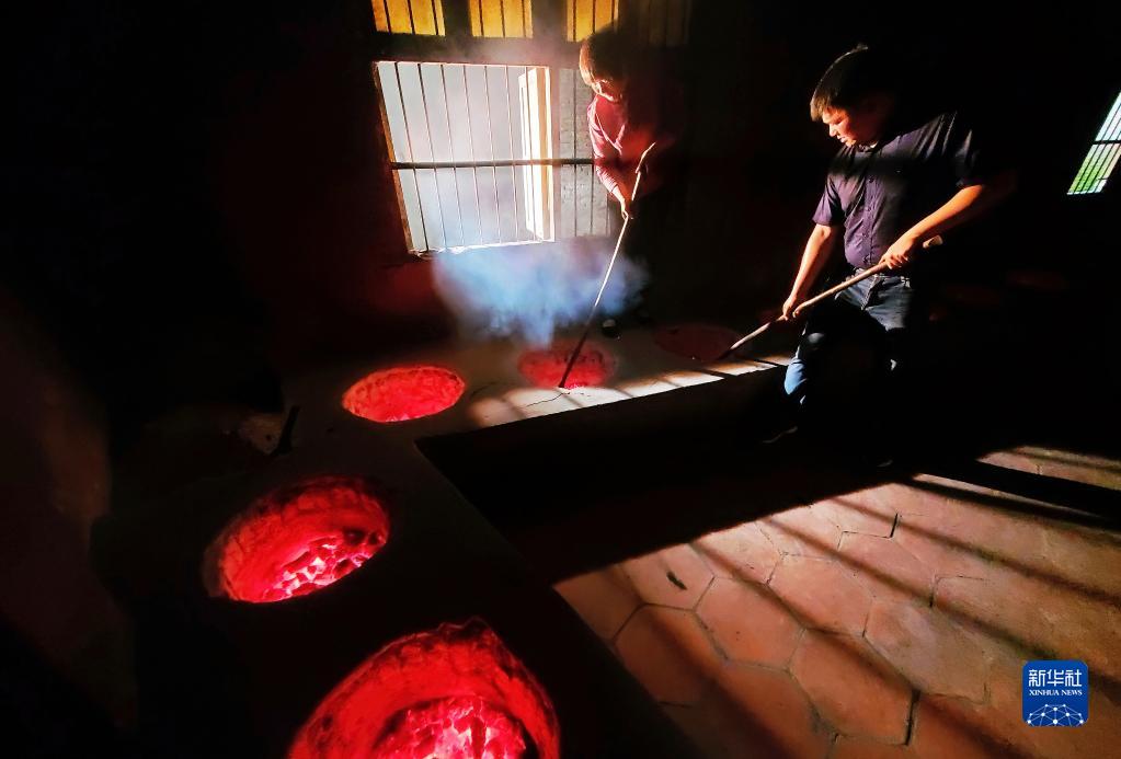 國家級非物質(zhì)文化遺產(chǎn)武夷巖茶(大紅袍)制作技藝的唯一女性傳承人游玉瓊(左)在指導兒子方舟學(xué)習武夷巖茶的木炭烘焙法(2020年5月10日攝)。新華社記者 魏培全 攝