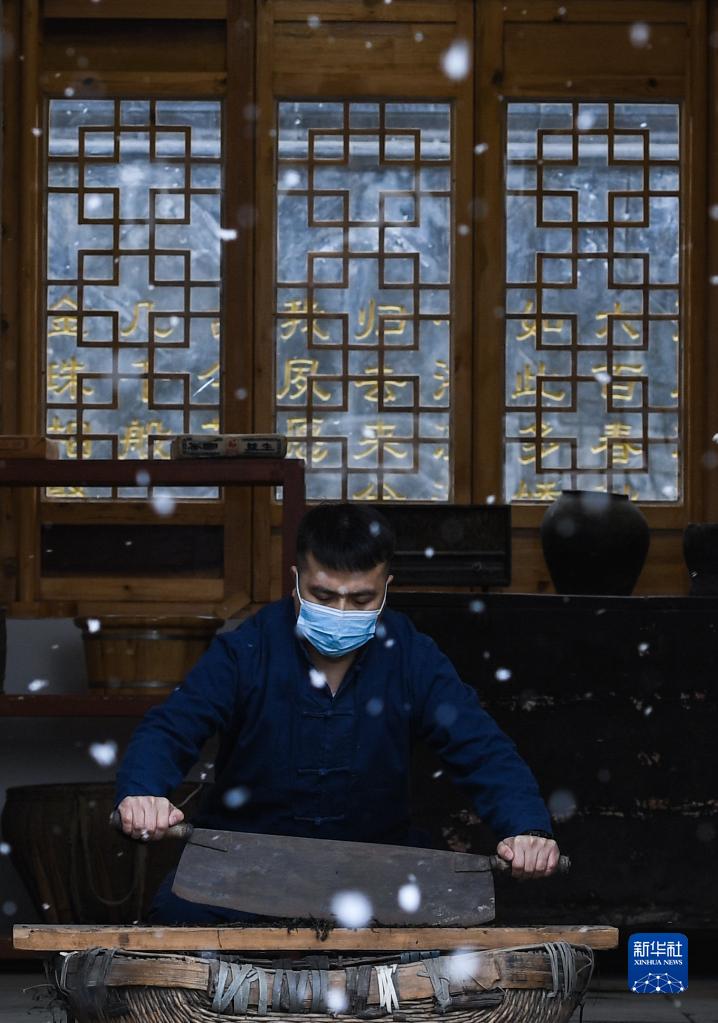 在咸陽(yáng)“益生源記”仿古茯茶作坊,筑茶師劉林展示切茶工藝(11月30日攝)。