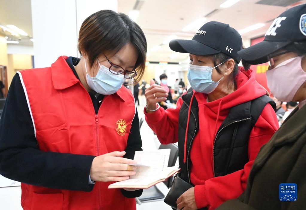 12月1日,工作人員(左)為到福州市政務(wù)服務(wù)中心辦理養老保險的退休老人解答有關(guān)辦理程序。