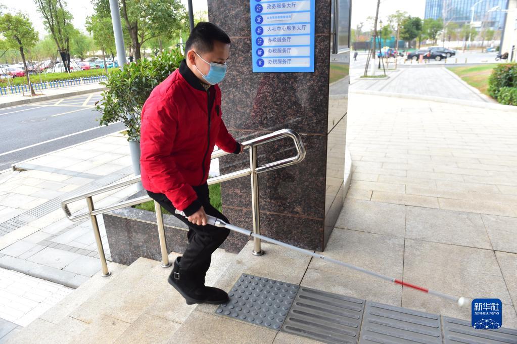 市民陳銳使用刻有盲文的臺階扶手前往江西省南昌市紅谷灘區市民中心(12月2日攝)。新華社記者 彭昭之 攝