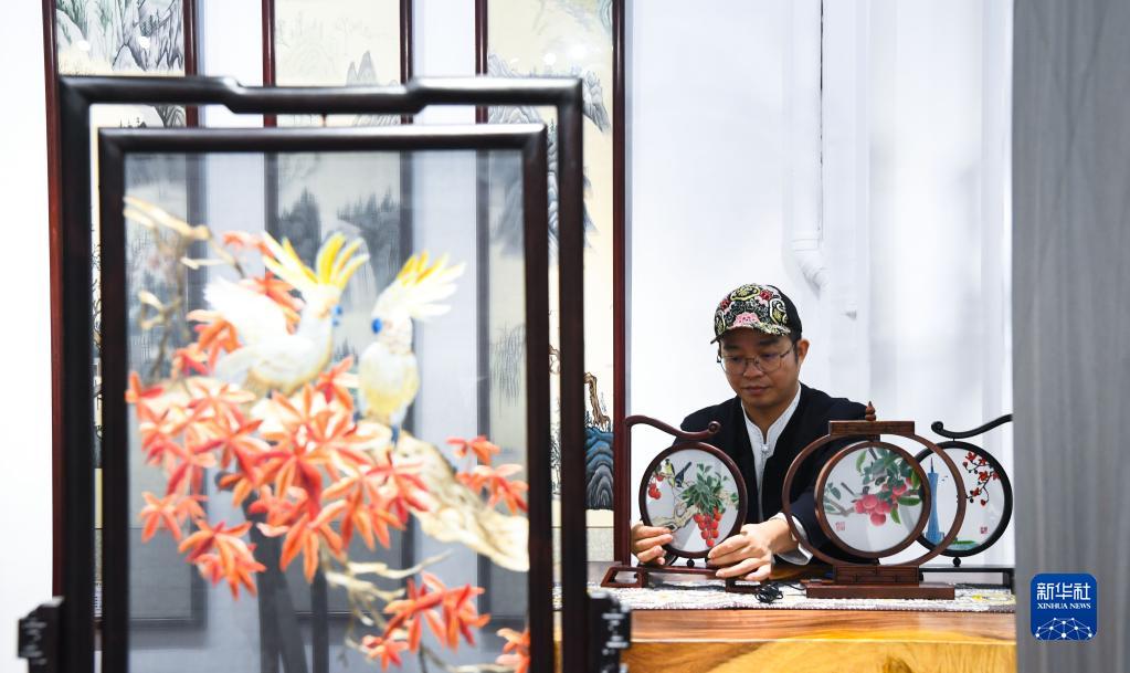 在廣州市荔灣區的工作室,王新元擺放廣繡作品(12月6日攝)。