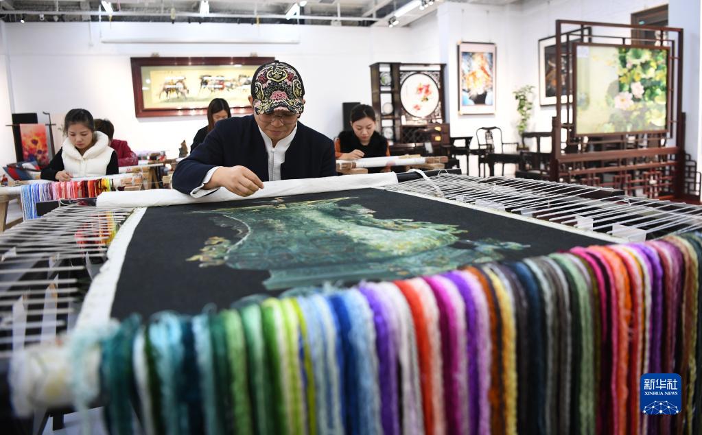 在廣州市荔灣區的工作室,王新元在制作一件以青銅器為主題的廣繡作品(12月6日攝)。