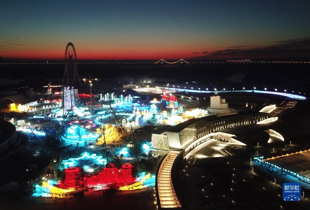 12月7日,施工人員在哈爾濱冰雪大世界園區施工作業(yè)(無(wú)人機照片)。