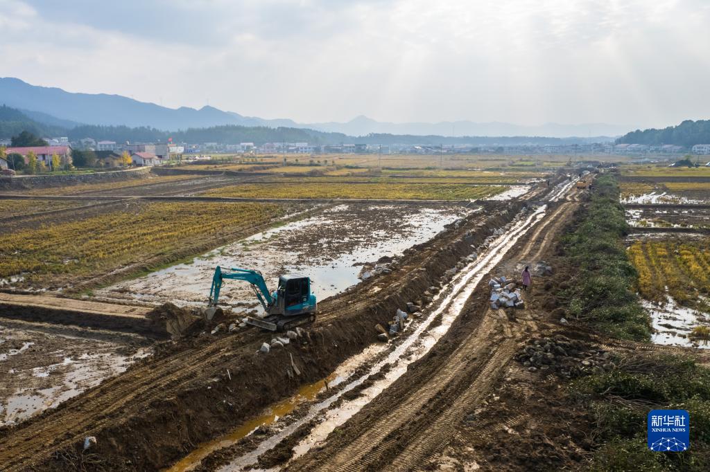 12月8日,工作人員在長(cháng)沙縣金井鎮龍華水庫泄洪河道治理工程項目建設現場(chǎng)施工(無(wú)人機照片)。