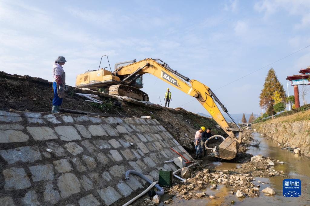 12月8日,工作人員在長(cháng)沙縣金井鎮湘豐村金脫河河道提質(zhì)改造項目建設現場(chǎng)施工(無(wú)人機照片)。