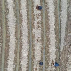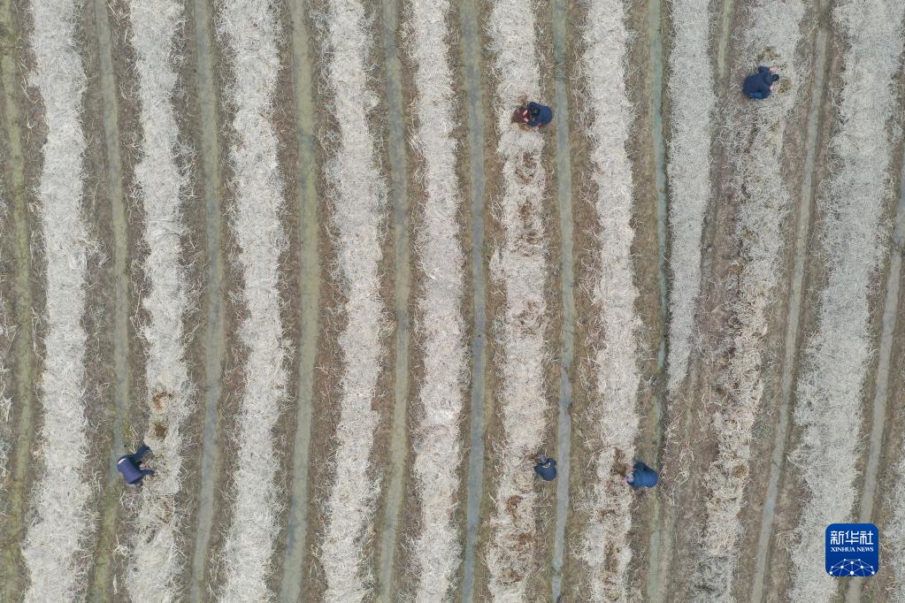 在江西省南昌市南昌縣幽蘭鎮,村民們在收割后的晚稻田里利用處理過(guò)的秸稈種植大球蓋菇(12月7日攝,無(wú)人機照片)。