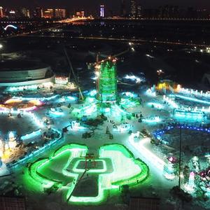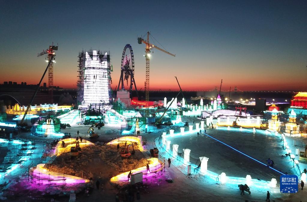 哈爾濱冰雪大世界主塔“冰雪之冠”封頂