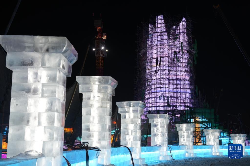 哈爾濱冰雪大世界主塔“冰雪之冠”封頂