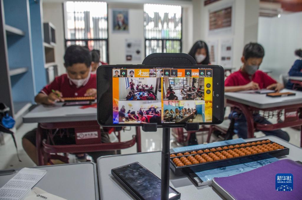 12月4日,在印度尼西亞萬(wàn)隆神墨教育學(xué)校,學(xué)生參與珠心算線(xiàn)上風(fēng)采展示活動(dòng),手機屏幕顯示的是全球其他活動(dòng)現場(chǎng)。
