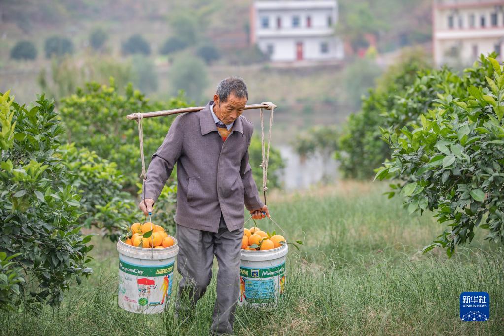 12月9日,在重慶市璧山區廣普鎮坪中村,村民在果園內挑運剛采摘下樹(shù)的臍橙。