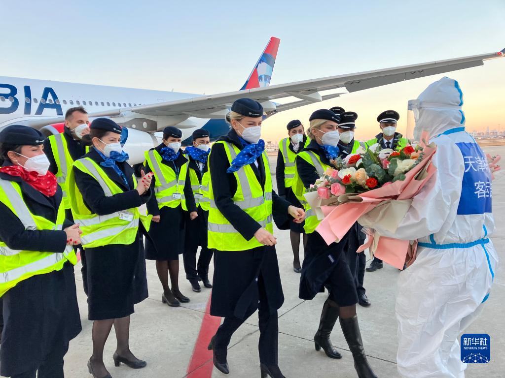 12月10日,天津濱海國際機場(chǎng)工作人員給JU702航班機組人員獻花。
