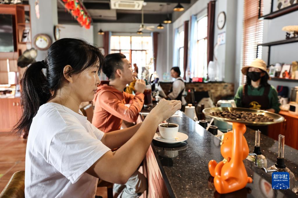 12月10日,在位于海南澄邁的才存咖啡館,顧客在享用咖啡飲品。