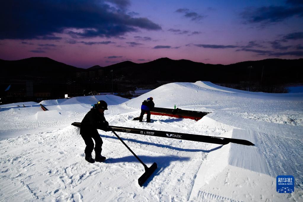V-PARK地形公園團隊成員在布置場(chǎng)地道具(12月9日攝)。