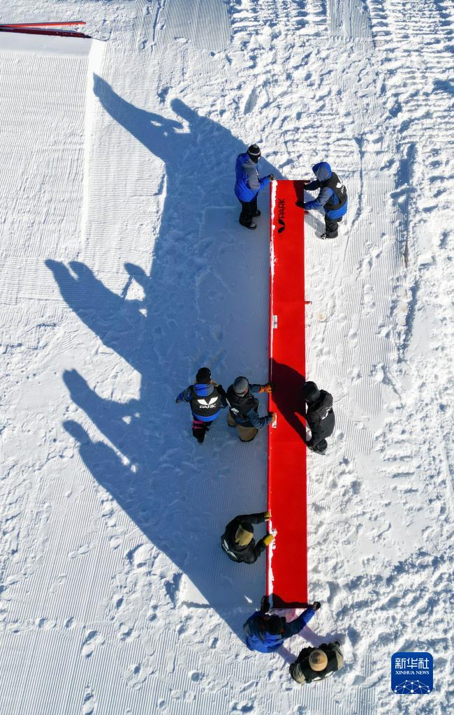 V-PARK地形公園團隊成員在搬運場(chǎng)地道具(無(wú)人機照片,12月9日攝)。