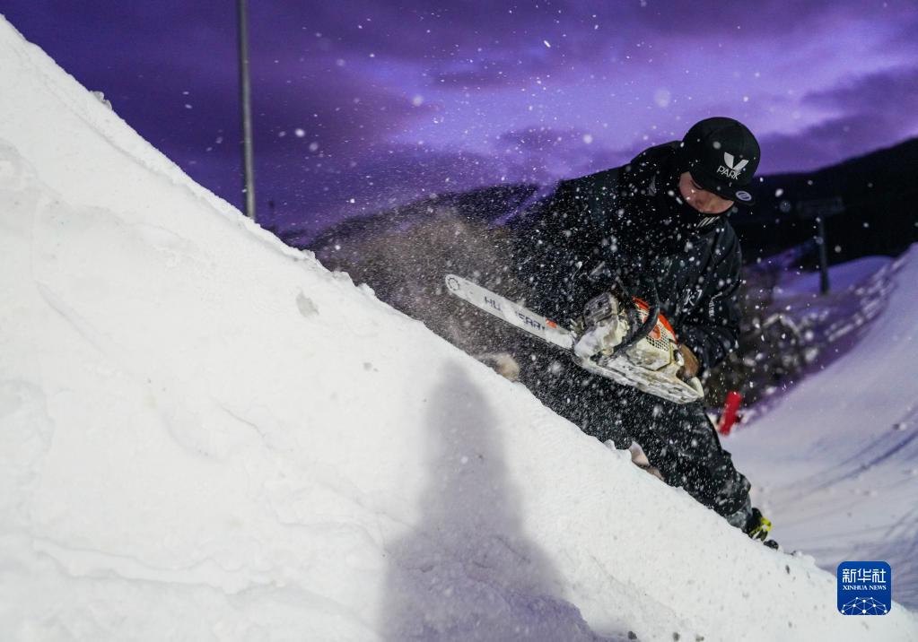 V-PARK地形公園主理人魏維用電鋸為跳臺塑形(12月10日攝)。