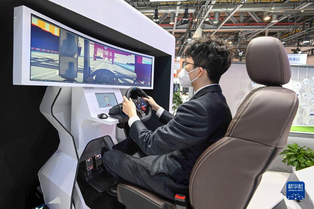 12月12日,工作人員在首屆全球數字貿易博覽會(huì )上展示智能港口無(wú)人駕駛集卡車(chē)控制系統。