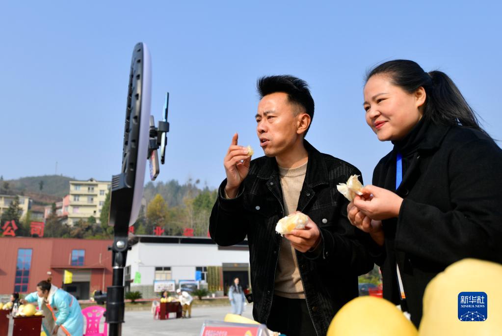 12月12日,網(wǎng)絡(luò )主播在宣恩縣沙道溝鎮欄桿坪村參加貢水白柚線(xiàn)上直播銷(xiāo)售擂臺賽。
