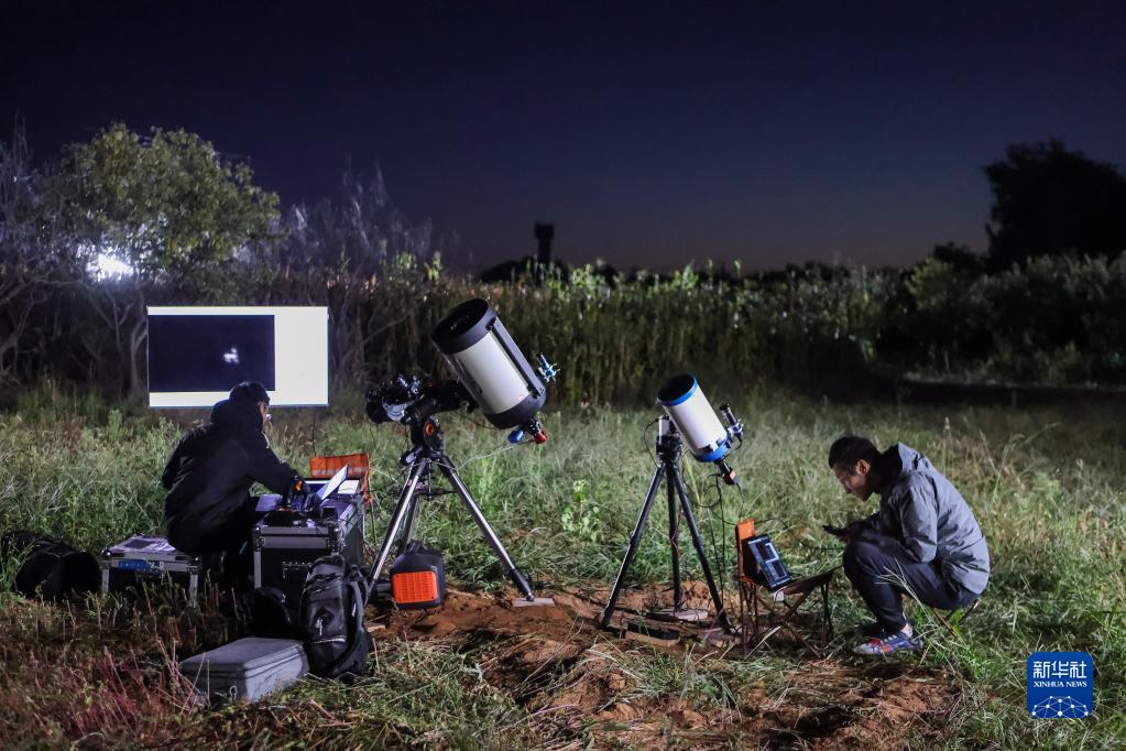 9月21日凌晨,劉博洋(左)在北京密云拍攝中國空間站過(guò)境,屏幕中為望遠鏡捕捉到的中國空間站過(guò)境實(shí)時(shí)畫(huà)面。