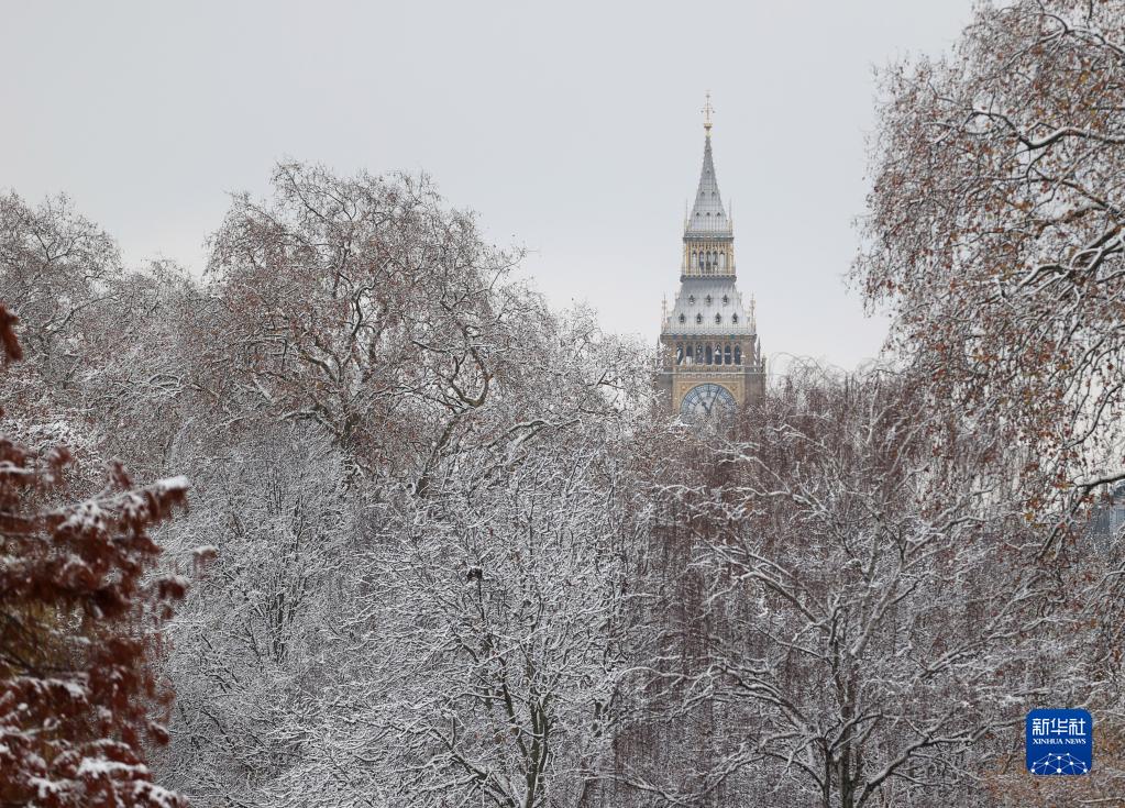 12月12日,英國倫敦大本鐘前的樹(shù)木被積雪覆蓋。