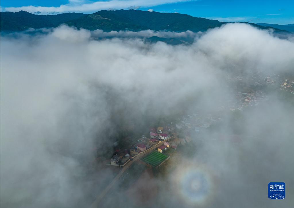 這是無(wú)人機拍攝的云霧間的云南省滄源佤族自治縣龍乃村足球場(chǎng)(12月8日攝)。