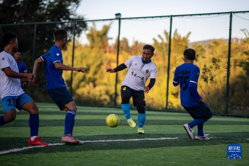 云南省滄源佤族自治縣龍乃村足球隊現任隊長(cháng)鮑艾改(右二)在一場(chǎng)比賽中(12月7日攝)。