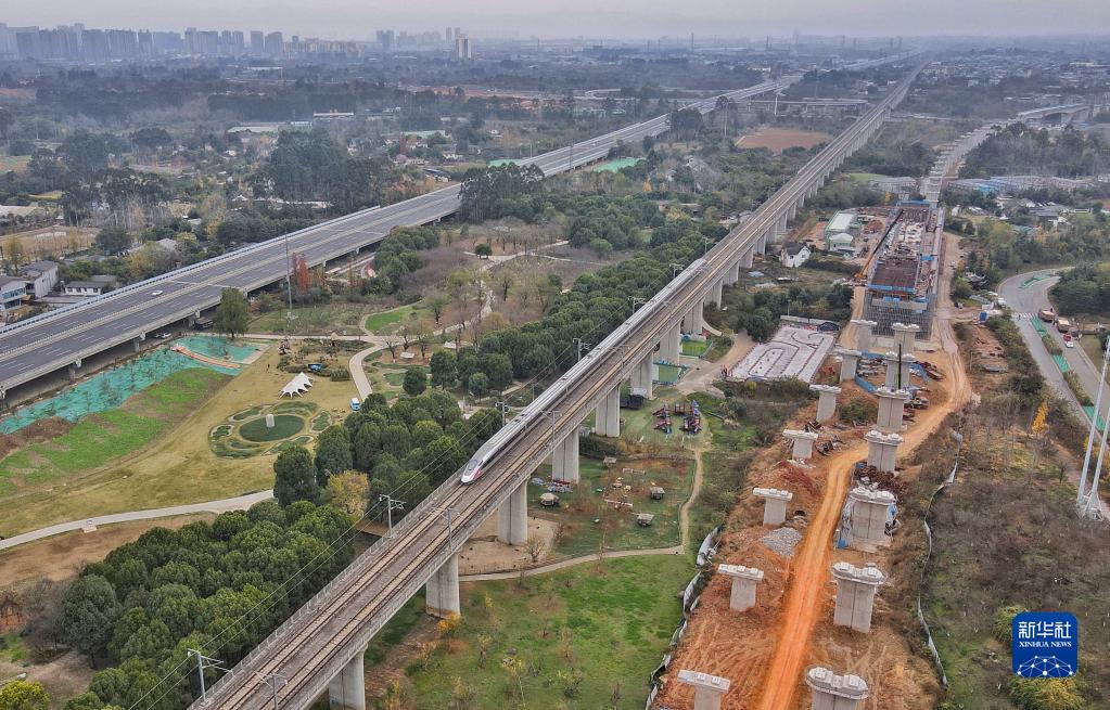 12月12日拍攝的成資渝高速公路(左)、成渝高鐵(中)和正在修建的成自宜高速鐵路(右)(無(wú)人機照片)。