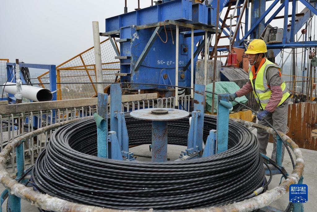 11月18日,工人在渝昆高鐵沱江特大橋施工現場(chǎng)作業(yè)。