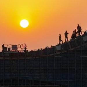 12月14日,工人在跨襄陽(yáng)北編組站大橋T3主塔上施工(無(wú)人機照片)。
