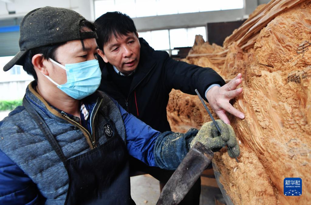 12月14日,國家級非遺項目莆田木雕省級代表性傳承人鄭春輝(右)在向員工傳授雕刻技藝。