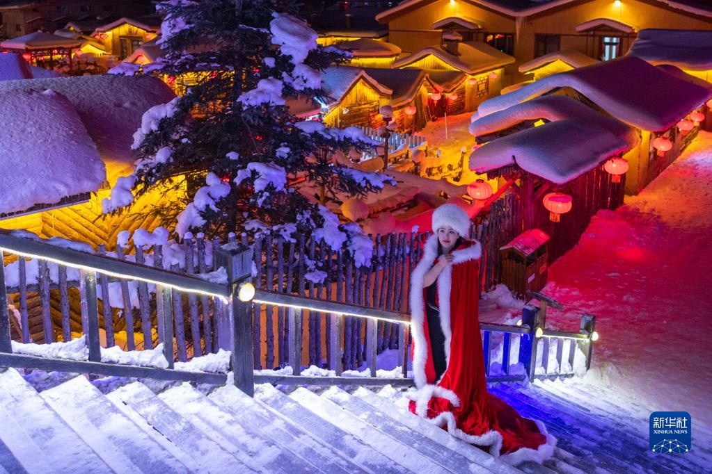 12月13日,游客租借服裝在雪鄉景區內留影。