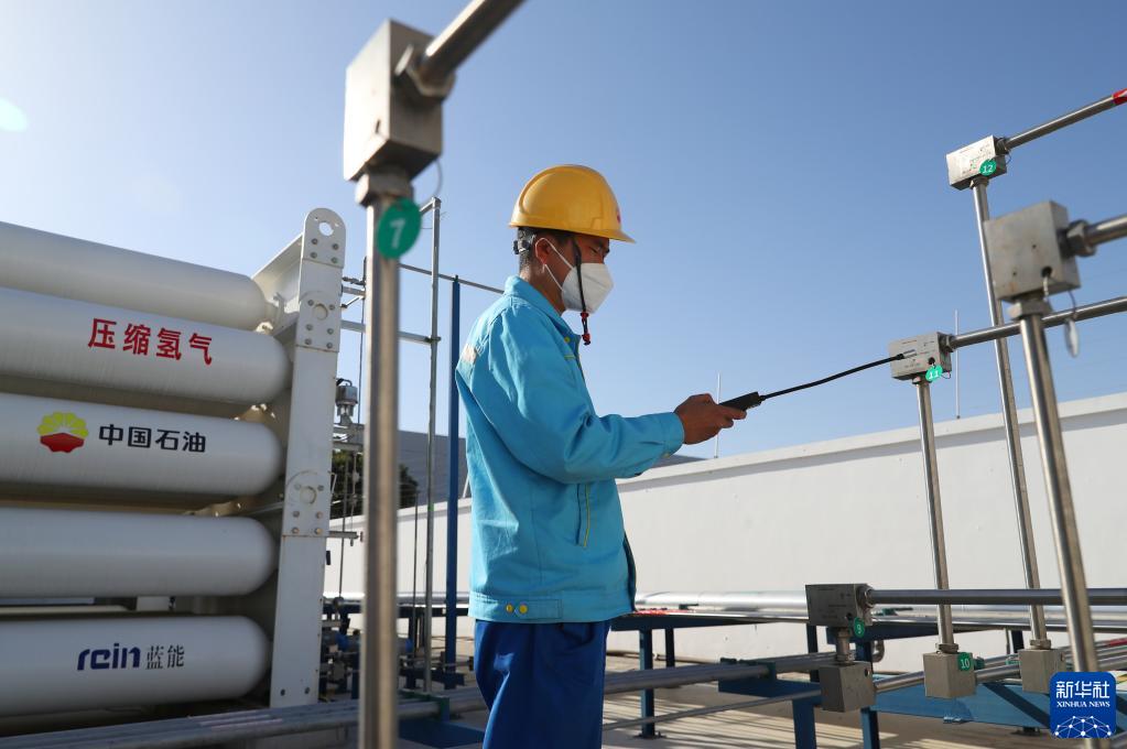 12月15日,一名工作人員在加氣站儲氫泵站內使用氫探筆監測設備密封狀況。