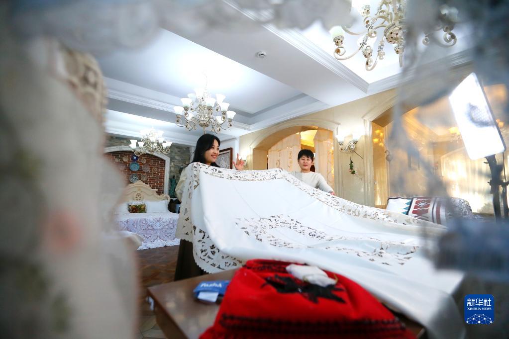 12月18日,在位于山東省青島市即墨區通濟街道的青島國華工藝品有限公司,營(yíng)銷(xiāo)人員通過(guò)直播平臺推介花邊產(chǎn)品。