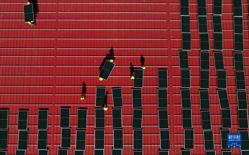 2022年10月11日,工人在河北省唐山市蘆臺經(jīng)濟開(kāi)發(fā)區一家企業(yè)廠(chǎng)房屋頂安裝光伏發(fā)電板(無(wú)人機照片)。