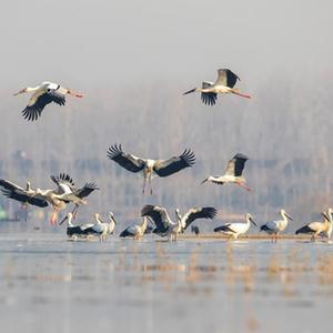 近日,數百只東方白鸛飛臨山東省臨沂市郯城縣沂河畔越冬,給平靜的河灘增添了一道靚麗的風(fēng)景。