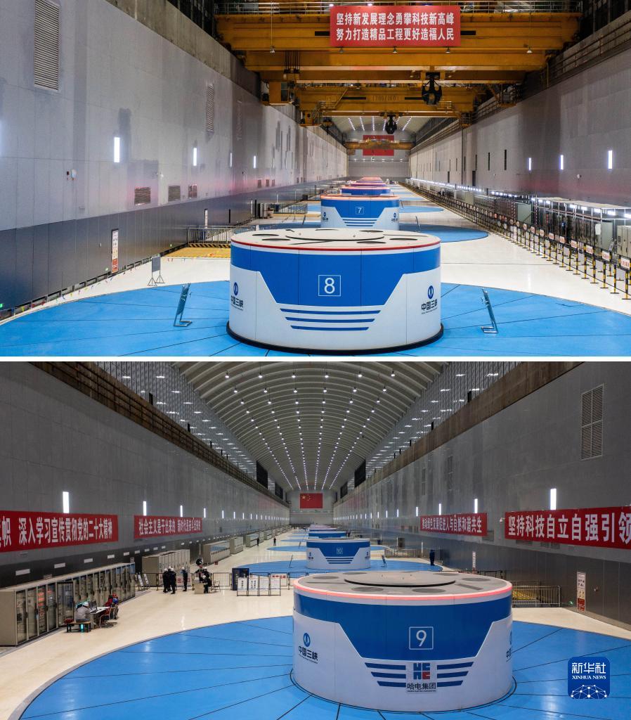這是一張拼版照片:上圖為12月19日無(wú)人機拍攝的白鶴灘水電站右岸地下廠(chǎng)房一景;下圖為12月19日無(wú)人機拍攝的白鶴灘水電站左岸地下廠(chǎng)房一景。