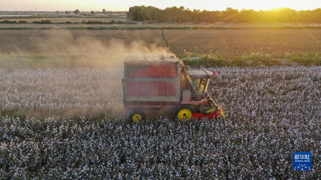 9月26日,新疆沙雅縣塔里木鄉其格格熱木村村民駕駛采棉機采收棉花(無(wú)人機照片)。