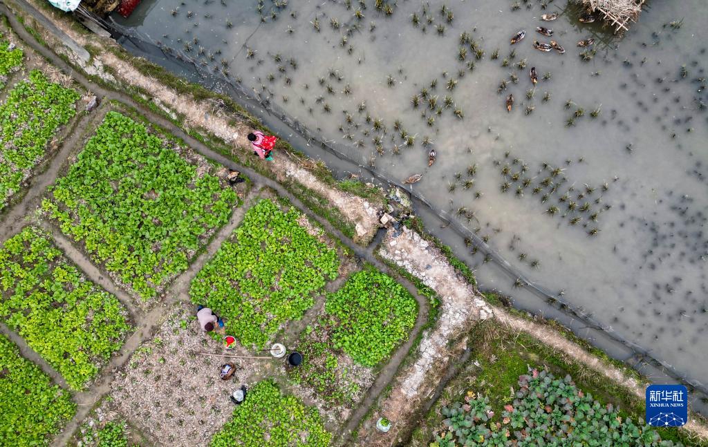 12月20日,村民在貴州省黔東南苗族侗族自治州從江縣貫洞鎮貫洞村田間管護蔬菜(無(wú)人機照片)。
