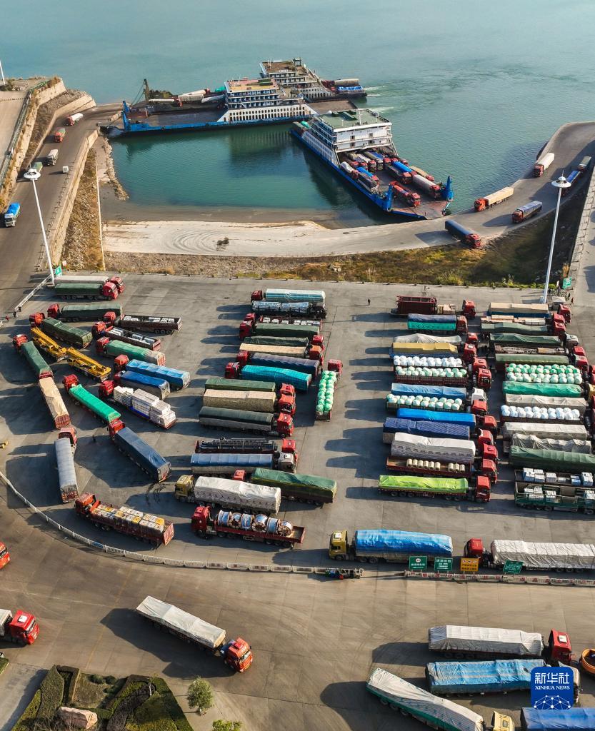 12月22日,大型貨車(chē)在三峽大壩上游湖北省宜昌市秭歸縣銀杏沱滾裝碼頭上、下船(無(wú)人機照片)。