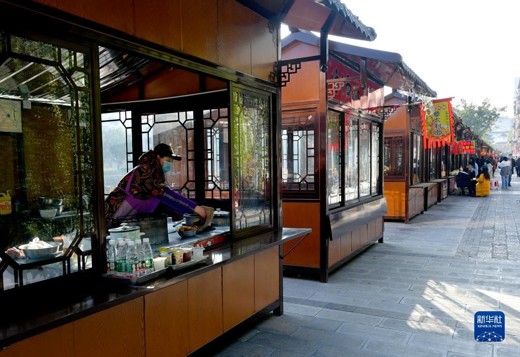 12月21日,在宣恩縣民族風(fēng)情街,經(jīng)營(yíng)者在“地攤小屋”售賣(mài)食品。
