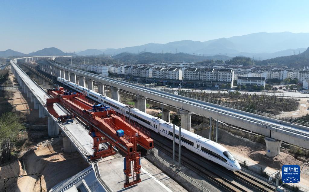 12月23日,在安徽池州,中鐵十一局池黃鐵路站前一標最后一榀箱梁架設完成(無(wú)人機照片)。